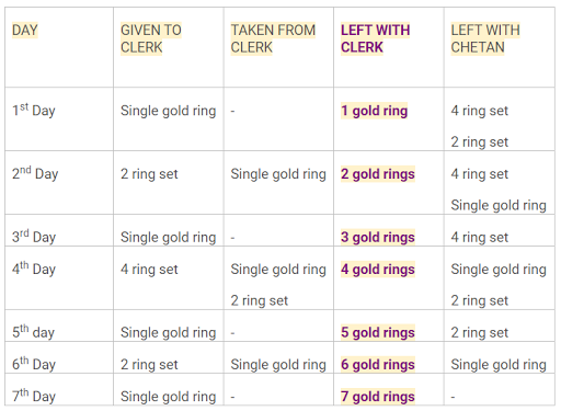 " Chetan arrives at a hotel. He has 2 sets of gold rings and a single gold ring. The first set of rings has 4 rings and the second set has 2. He cannot take the sets of rings apart, or exchange them for a different form of currency, and the hotel clerk has no change. He wants to stay at the hotel for 7 nights, and he has to pay one gold ring for each night that he stays. He cannot pay in advance for any day or all, neither can he pay all at once at the end of his stay.